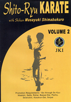 Shitō-Ryū Karate (Volume 2) featuring Masayuki Shimabukuro, with AAU champions Mike Chavarria, David Bertrand, and Kako Lee. Narrated by Leonard J. Pellman © 2007 Volume 2 presents the kata (solo practice patterns) required by the Nippon Karate-dō Jikishin-Kai for promotion in rank from yonkyū (4th kyū) through shodan-ho (provisional black belt) including: Niseishi, Saifa, Rōhai, Bassai-Dai, Pachū, Seienchin, Kōsōkun-Dai, and Seipai. Just $29.95 (plus shipping) or $26.95 for Seishin-Kan members. Ships Priority Mail unless otherwise requested.